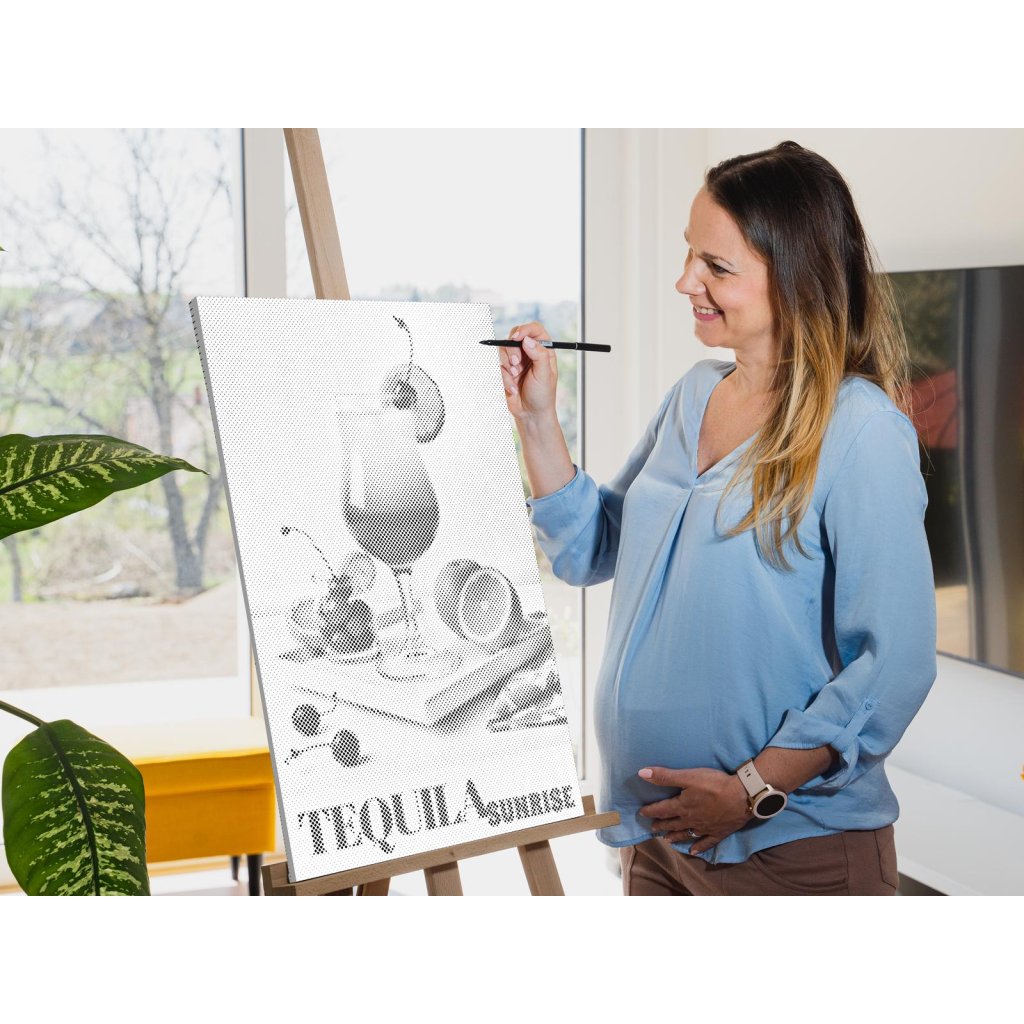Hlavná úloha spočíva vo vypĺňaní koliesok rôznych veľkostí, predtlačených na plátne, farebnou fixkou. U niektorých stačí urobiť malú bodku, u väčších koliesok je skôr potrebné vyfarbovať. Chce to trochu trpezlivosti, ale keď sa vám stovky malých bodiek začnú pred očami premieňať na zvolený motív, budete mať chuť začať skákať od radosti. Keď urobíte poslednú bodku za svojím dielom, môžete obdivovať fotku premenenú na dvojfarebnú nádheru a rovno si ju zavesiť na stenu (ak si zvolíte obraz s vnútorným rámom).