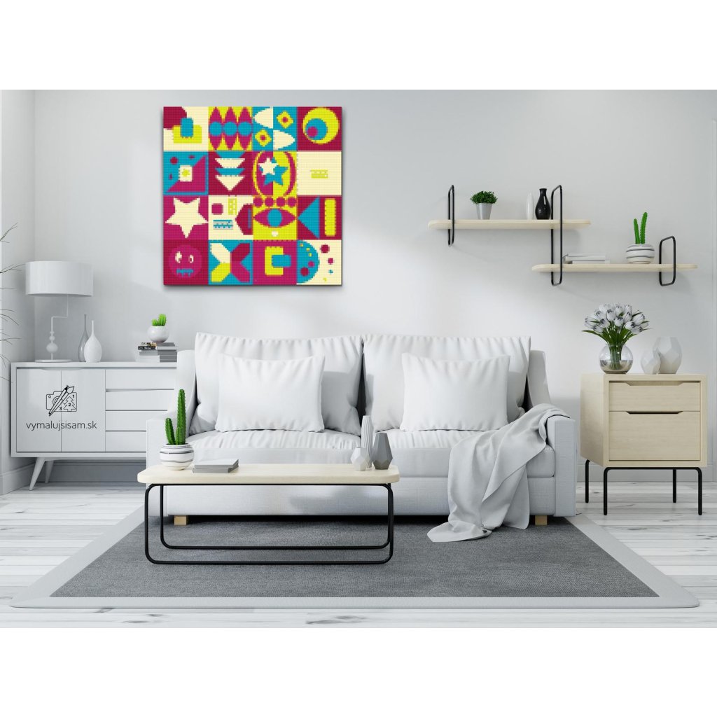Na plátno budete ukladať malé plastové diamanty s priemerom 2,8 mm. Od nás dostanete všetky potrebné farby špeciálne pre váš obraz, rozdelené do vrecúšok. Odtieňov rôznych farieb sú stovky až tisíce, vďaka čomu je výsledný obraz prakticky dokonalý. Každé vrecúško obsahuje jednu konkrétnu farbu/odtieň a je označené číslom alebo symbolom. Celé plátno pokrývajú stovky symbolov, na ktoré budete ukladať farebné diamanty zodpovedajúce svojím označením danému číslu alebo symbolu. Nemusíte sa báť, že by ste diamantov mali málo. Množstvo vo vrecúšku je veľkorysé a z každého odtieňa budete mať dostatočnú rezervu.
