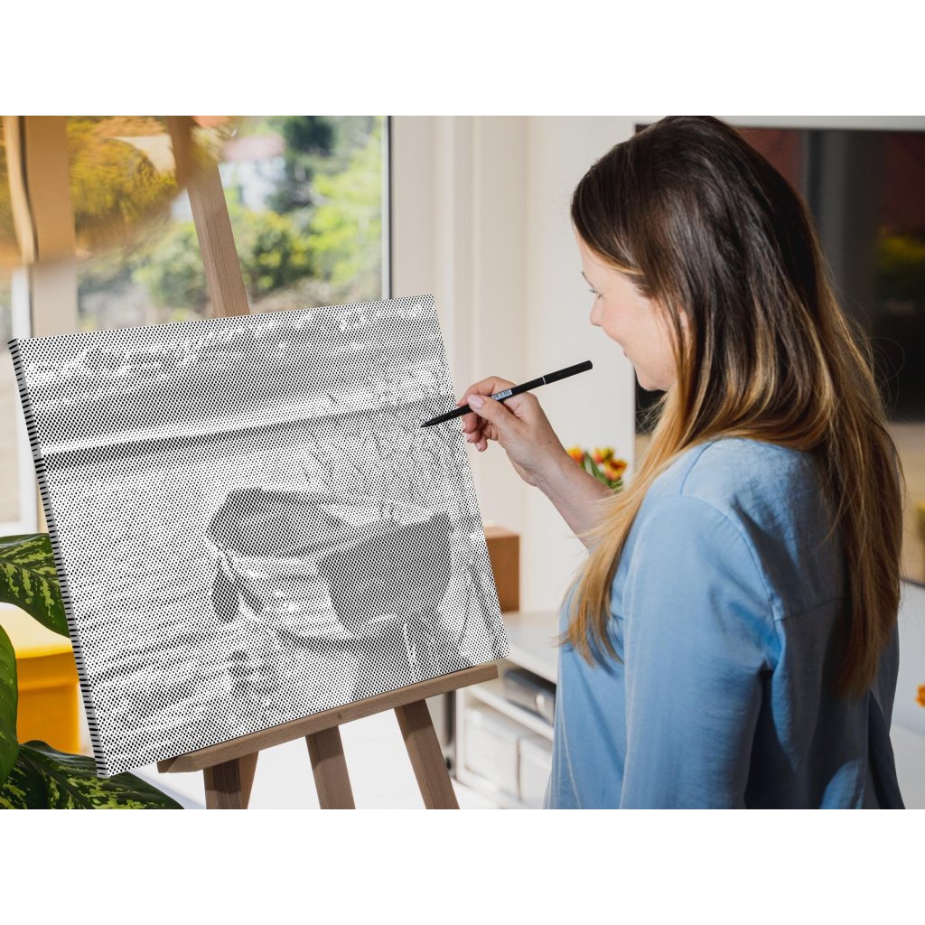 Hlavná úloha spočíva vo vypĺňaní koliesok rôznych veľkostí, predtlačených na plátne, farebnou fixkou. U niektorých stačí urobiť malú bodku, u väčších koliesok je skôr potrebné vyfarbovať. Chce to trochu trpezlivosti, ale keď sa vám stovky malých bodiek začnú pred očami premieňať na zvolený motív, budete mať chuť začať skákať od radosti. Keď urobíte poslednú bodku za svojím dielom, môžete obdivovať fotku premenenú na dvojfarebnú nádheru a rovno si ju zavesiť na stenu (ak si zvolíte obraz s vnútorným rámom).