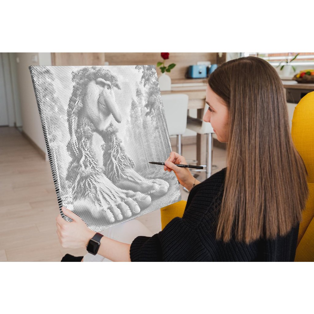 Hlavná úloha spočíva vo vypĺňaní koliesok rôznych veľkostí, predtlačených na plátne, farebnou fixkou. U niektorých stačí urobiť malú bodku, u väčších koliesok je skôr potrebné vyfarbovať. Chce to trochu trpezlivosti, ale keď sa vám stovky malých bodiek začnú pred očami premieňať na zvolený motív, budete mať chuť začať skákať od radosti. Keď urobíte poslednú bodku za svojím dielom, môžete obdivovať fotku premenenú na dvojfarebnú nádheru a rovno si ju zavesiť na stenu (ak si zvolíte obraz s vnútorným rámom).