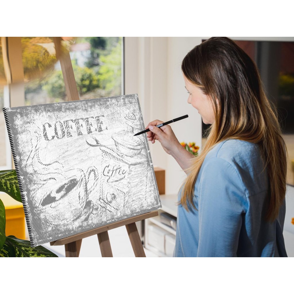Hlavná úloha spočíva vo vypĺňaní koliesok rôznych veľkostí, predtlačených na plátne, farebnou fixkou. U niektorých stačí urobiť malú bodku, u väčších koliesok je skôr potrebné vyfarbovať. Chce to trochu trpezlivosti, ale keď sa vám stovky malých bodiek začnú pred očami premieňať na zvolený motív, budete mať chuť začať skákať od radosti. Keď urobíte poslednú bodku za svojím dielom, môžete obdivovať fotku premenenú na dvojfarebnú nádheru a rovno si ju zavesiť na stenu (ak si zvolíte obraz s vnútorným rámom).