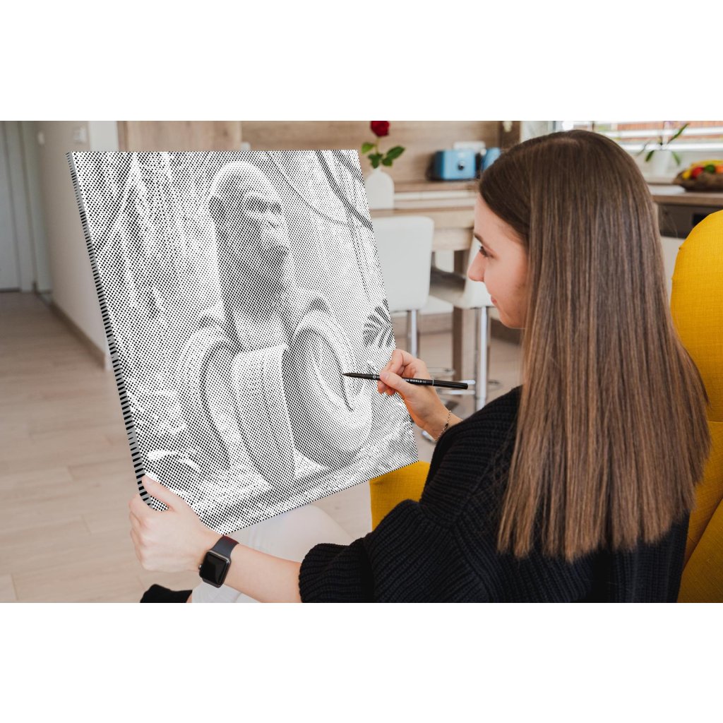 Hlavná úloha spočíva vo vypĺňaní koliesok rôznych veľkostí, predtlačených na plátne, farebnou fixkou. U niektorých stačí urobiť malú bodku, u väčších koliesok je skôr potrebné vyfarbovať. Chce to trochu trpezlivosti, ale keď sa vám stovky malých bodiek začnú pred očami premieňať na zvolený motív, budete mať chuť začať skákať od radosti. Keď urobíte poslednú bodku za svojím dielom, môžete obdivovať fotku premenenú na dvojfarebnú nádheru a rovno si ju zavesiť na stenu (ak si zvolíte obraz s vnútorným rámom).