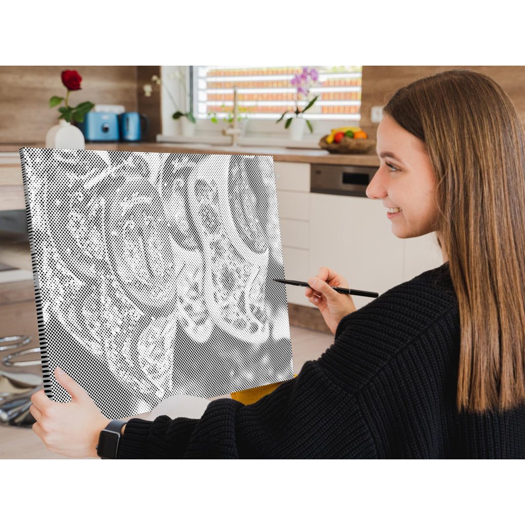 Hlavná úloha spočíva vo vypĺňaní koliesok rôznych veľkostí, predtlačených na plátne, farebnou fixkou. U niektorých stačí urobiť malú bodku, u väčších koliesok je skôr potrebné vyfarbovať. Chce to trochu trpezlivosti, ale keď sa vám stovky malých bodiek začnú pred očami premieňať na zvolený motív, budete mať chuť začať skákať od radosti. Keď urobíte poslednú bodku za svojím dielom, môžete obdivovať fotku premenenú na dvojfarebnú nádheru a rovno si ju zavesiť na stenu (ak si zvolíte obraz s vnútorným rámom).