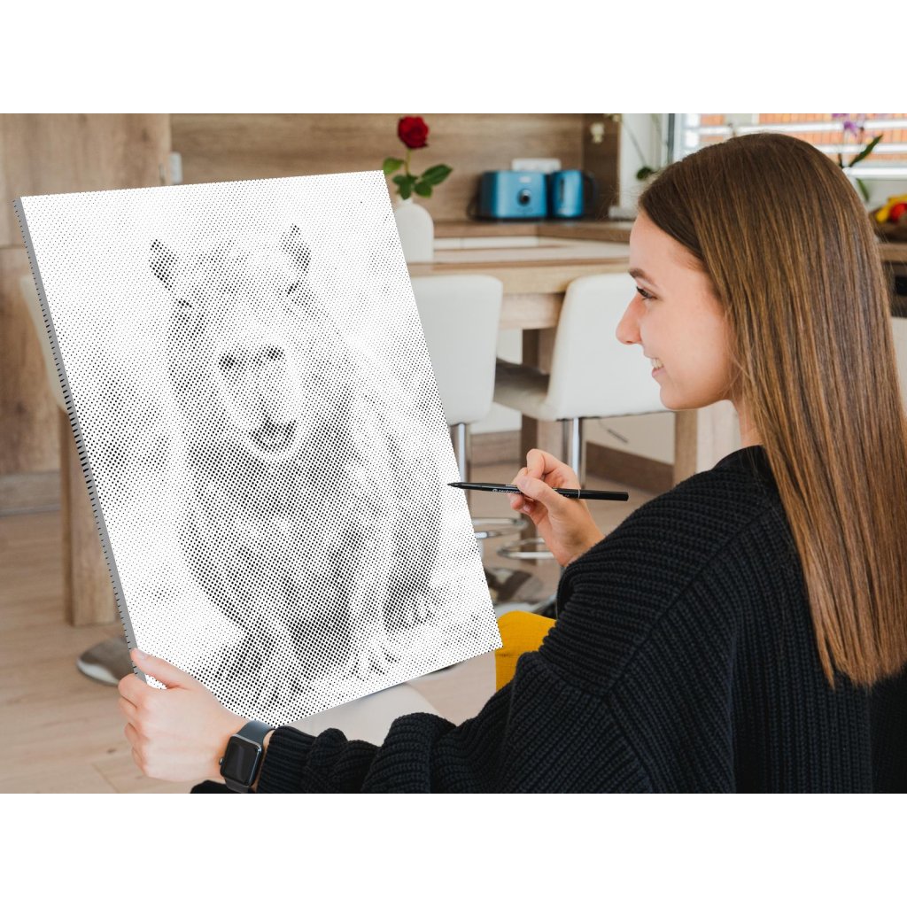 Hlavná úloha spočíva vo vypĺňaní koliesok rôznych veľkostí, predtlačených na plátne, farebnou fixkou. U niektorých stačí urobiť malú bodku, u väčších koliesok je skôr potrebné vyfarbovať. Chce to trochu trpezlivosti, ale keď sa vám stovky malých bodiek začnú pred očami premieňať na zvolený motív, budete mať chuť začať skákať od radosti. Keď urobíte poslednú bodku za svojím dielom, môžete obdivovať fotku premenenú na dvojfarebnú nádheru a rovno si ju zavesiť na stenu (ak si zvolíte obraz s vnútorným rámom).