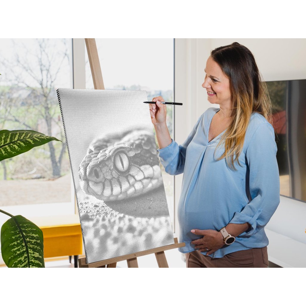 Hlavná úloha spočíva vo vypĺňaní koliesok rôznych veľkostí, predtlačených na plátne, farebnou fixkou. U niektorých stačí urobiť malú bodku, u väčších koliesok je skôr potrebné vyfarbovať. Chce to trochu trpezlivosti, ale keď sa vám stovky malých bodiek začnú pred očami premieňať na zvolený motív, budete mať chuť začať skákať od radosti. Keď urobíte poslednú bodku za svojím dielom, môžete obdivovať fotku premenenú na dvojfarebnú nádheru a rovno si ju zavesiť na stenu (ak si zvolíte obraz s vnútorným rámom).