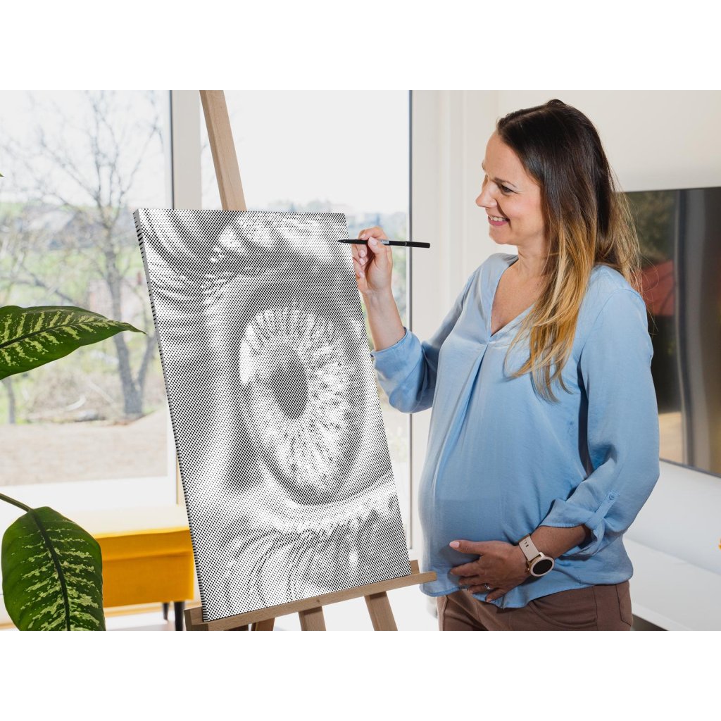 Hlavná úloha spočíva vo vypĺňaní koliesok rôznych veľkostí, predtlačených na plátne, farebnou fixkou. U niektorých stačí urobiť malú bodku, u väčších koliesok je skôr potrebné vyfarbovať. Chce to trochu trpezlivosti, ale keď sa vám stovky malých bodiek začnú pred očami premieňať na zvolený motív, budete mať chuť začať skákať od radosti. Keď urobíte poslednú bodku za svojím dielom, môžete obdivovať fotku premenenú na dvojfarebnú nádheru a rovno si ju zavesiť na stenu (ak si zvolíte obraz s vnútorným rámom).