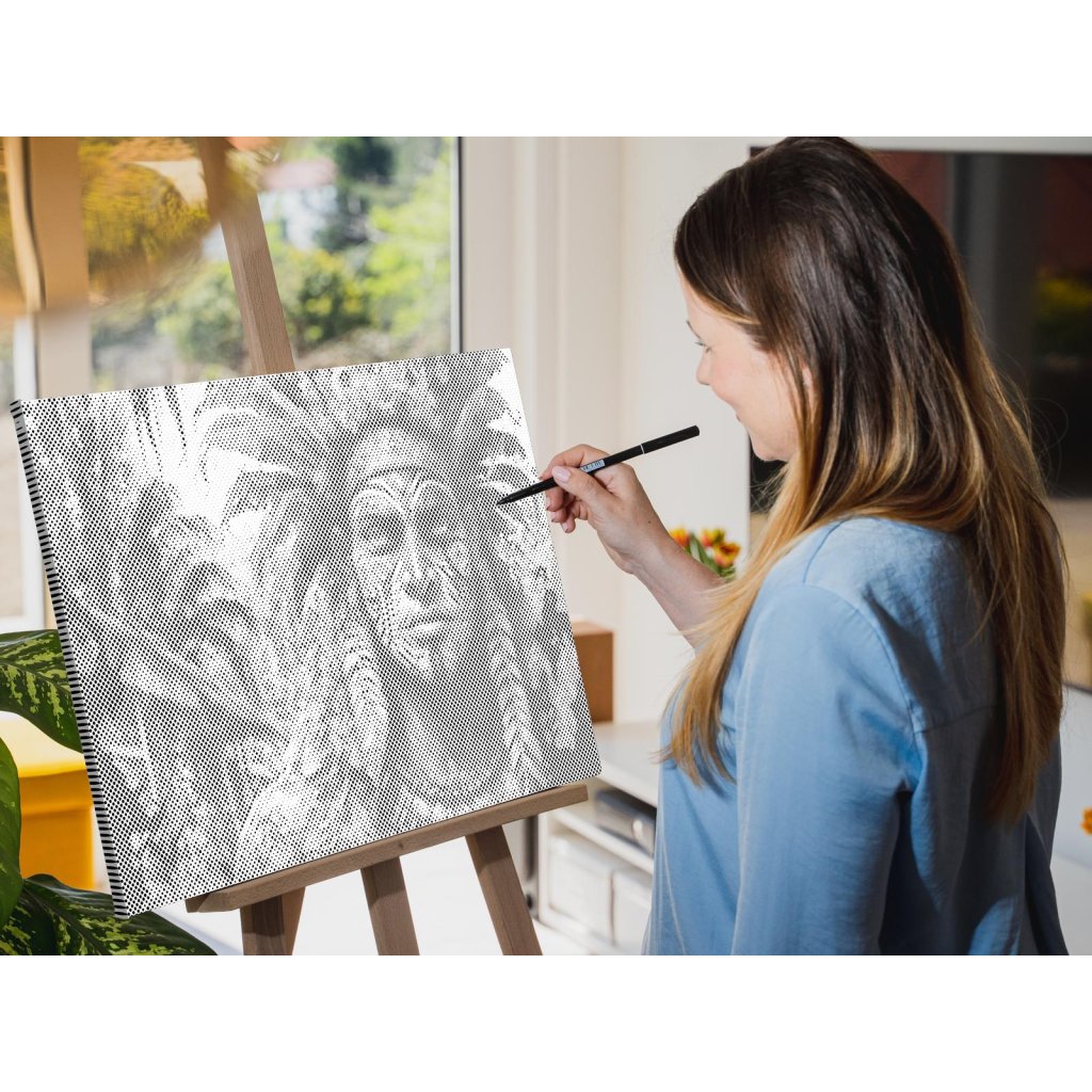 Hlavná úloha spočíva vo vypĺňaní koliesok rôznych veľkostí, predtlačených na plátne, farebnou fixkou. U niektorých stačí urobiť malú bodku, u väčších koliesok je skôr potrebné vyfarbovať. Chce to trochu trpezlivosti, ale keď sa vám stovky malých bodiek začnú pred očami premieňať na zvolený motív, budete mať chuť začať skákať od radosti. Keď urobíte poslednú bodku za svojím dielom, môžete obdivovať fotku premenenú na dvojfarebnú nádheru a rovno si ju zavesiť na stenu (ak si zvolíte obraz s vnútorným rámom).
