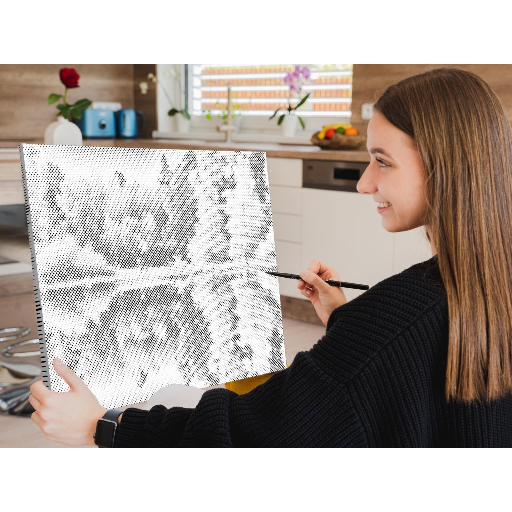Hlavná úloha spočíva vo vypĺňaní koliesok rôznych veľkostí, predtlačených na plátne, farebnou fixkou. U niektorých stačí urobiť malú bodku, u väčších koliesok je skôr potrebné vyfarbovať. Chce to trochu trpezlivosti, ale keď sa vám stovky malých bodiek začnú pred očami premieňať na zvolený motív, budete mať chuť začať skákať od radosti. Keď urobíte poslednú bodku za svojím dielom, môžete obdivovať fotku premenenú na dvojfarebnú nádheru a rovno si ju zavesiť na stenu (ak si zvolíte obraz s vnútorným rámom).