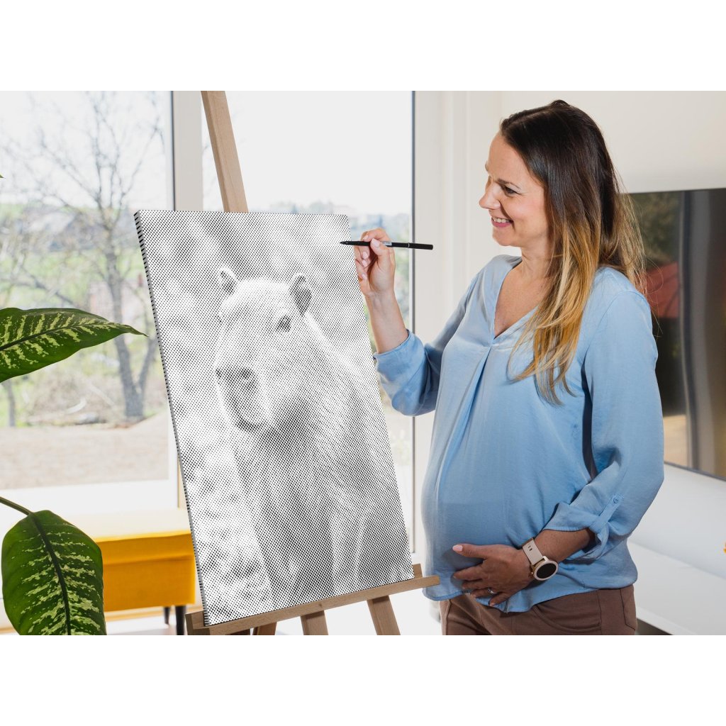 Hlavná úloha spočíva vo vypĺňaní koliesok rôznych veľkostí, predtlačených na plátne, farebnou fixkou. U niektorých stačí urobiť malú bodku, u väčších koliesok je skôr potrebné vyfarbovať. Chce to trochu trpezlivosti, ale keď sa vám stovky malých bodiek začnú pred očami premieňať na zvolený motív, budete mať chuť začať skákať od radosti. Keď urobíte poslednú bodku za svojím dielom, môžete obdivovať fotku premenenú na dvojfarebnú nádheru a rovno si ju zavesiť na stenu (ak si zvolíte obraz s vnútorným rámom).