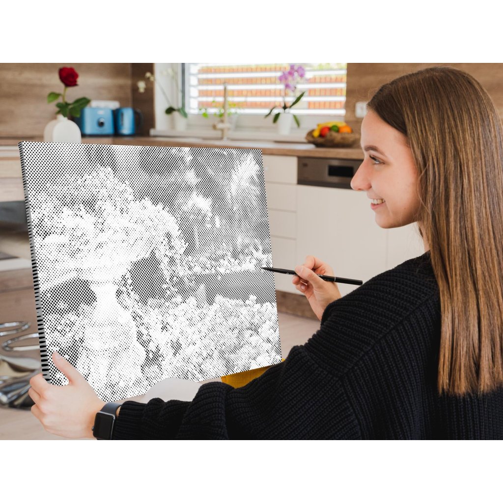 Hlavná úloha spočíva vo vypĺňaní koliesok rôznych veľkostí, predtlačených na plátne, farebnou fixkou. U niektorých stačí urobiť malú bodku, u väčších koliesok je skôr potrebné vyfarbovať. Chce to trochu trpezlivosti, ale keď sa vám stovky malých bodiek začnú pred očami premieňať na zvolený motív, budete mať chuť začať skákať od radosti. Keď urobíte poslednú bodku za svojím dielom, môžete obdivovať fotku premenenú na dvojfarebnú nádheru a rovno si ju zavesiť na stenu (ak si zvolíte obraz s vnútorným rámom).