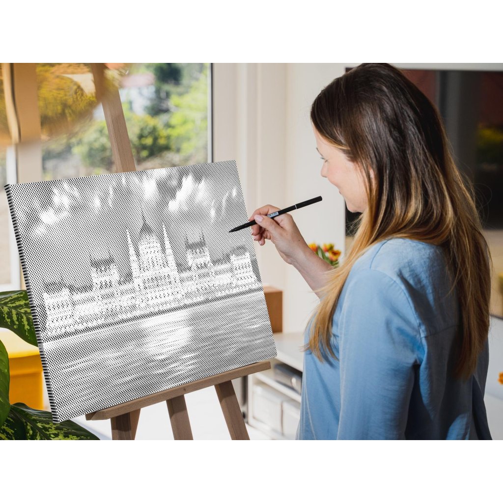 Hlavná úloha spočíva vo vypĺňaní koliesok rôznych veľkostí, predtlačených na plátne, farebnou fixkou. U niektorých stačí urobiť malú bodku, u väčších koliesok je skôr potrebné vyfarbovať. Chce to trochu trpezlivosti, ale keď sa vám stovky malých bodiek začnú pred očami premieňať na zvolený motív, budete mať chuť začať skákať od radosti. Keď urobíte poslednú bodku za svojím dielom, môžete obdivovať fotku premenenú na dvojfarebnú nádheru a rovno si ju zavesiť na stenu (ak si zvolíte obraz s vnútorným rámom).