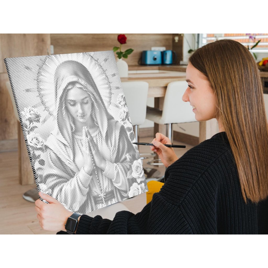Hlavná úloha spočíva vo vypĺňaní koliesok rôznych veľkostí, predtlačených na plátne, farebnou fixkou. U niektorých stačí urobiť malú bodku, u väčších koliesok je skôr potrebné vyfarbovať. Chce to trochu trpezlivosti, ale keď sa vám stovky malých bodiek začnú pred očami premieňať na zvolený motív, budete mať chuť začať skákať od radosti. Keď urobíte poslednú bodku za svojím dielom, môžete obdivovať fotku premenenú na dvojfarebnú nádheru a rovno si ju zavesiť na stenu (ak si zvolíte obraz s vnútorným rámom).