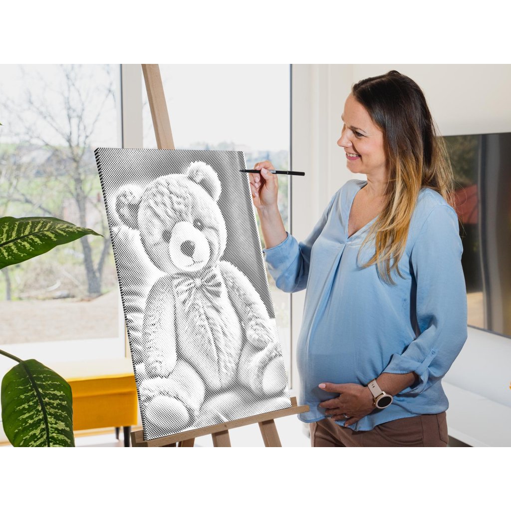 Hlavná úloha spočíva vo vypĺňaní koliesok rôznych veľkostí, predtlačených na plátne, farebnou fixkou. U niektorých stačí urobiť malú bodku, u väčších koliesok je skôr potrebné vyfarbovať. Chce to trochu trpezlivosti, ale keď sa vám stovky malých bodiek začnú pred očami premieňať na zvolený motív, budete mať chuť začať skákať od radosti. Keď urobíte poslednú bodku za svojím dielom, môžete obdivovať fotku premenenú na dvojfarebnú nádheru a rovno si ju zavesiť na stenu (ak si zvolíte obraz s vnútorným rámom).