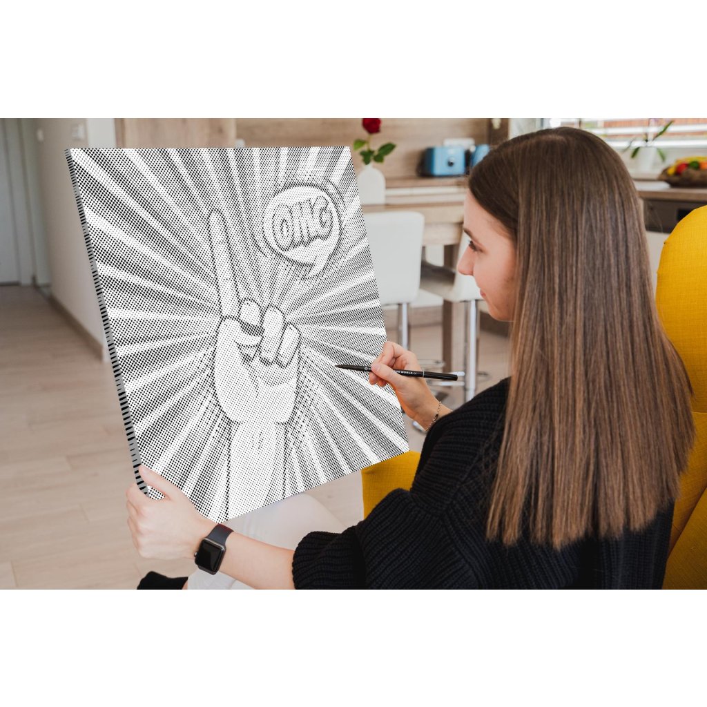 Hlavná úloha spočíva vo vypĺňaní koliesok rôznych veľkostí, predtlačených na plátne, farebnou fixkou. U niektorých stačí urobiť malú bodku, u väčších koliesok je skôr potrebné vyfarbovať. Chce to trochu trpezlivosti, ale keď sa vám stovky malých bodiek začnú pred očami premieňať na zvolený motív, budete mať chuť začať skákať od radosti. Keď urobíte poslednú bodku za svojím dielom, môžete obdivovať fotku premenenú na dvojfarebnú nádheru a rovno si ju zavesiť na stenu (ak si zvolíte obraz s vnútorným rámom).