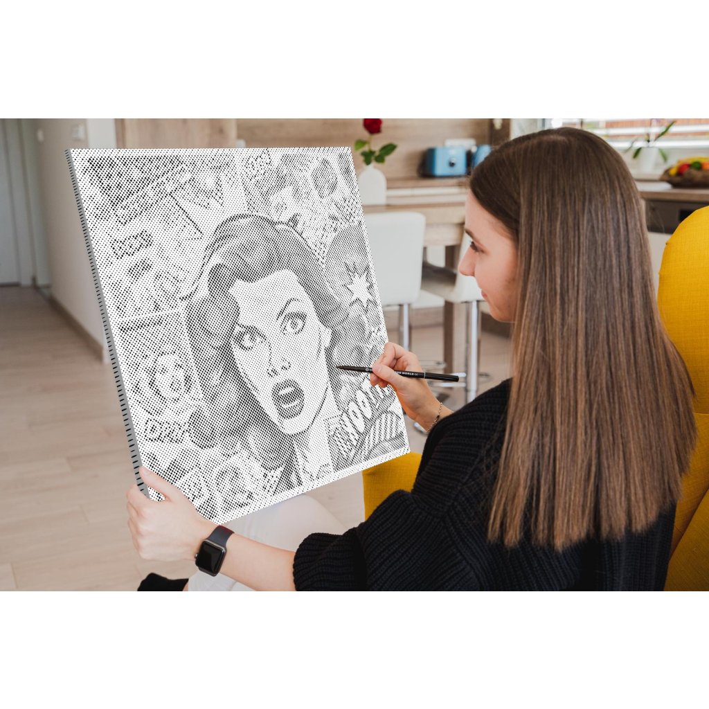 Hlavná úloha spočíva vo vypĺňaní koliesok rôznych veľkostí, predtlačených na plátne, farebnou fixkou. U niektorých stačí urobiť malú bodku, u väčších koliesok je skôr potrebné vyfarbovať. Chce to trochu trpezlivosti, ale keď sa vám stovky malých bodiek začnú pred očami premieňať na zvolený motív, budete mať chuť začať skákať od radosti. Keď urobíte poslednú bodku za svojím dielom, môžete obdivovať fotku premenenú na dvojfarebnú nádheru a rovno si ju zavesiť na stenu (ak si zvolíte obraz s vnútorným rámom).