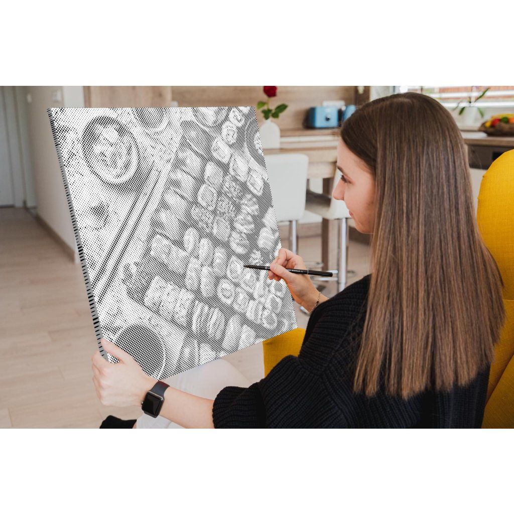 Hlavná úloha spočíva vo vypĺňaní koliesok rôznych veľkostí, predtlačených na plátne, farebnou fixkou. U niektorých stačí urobiť malú bodku, u väčších koliesok je skôr potrebné vyfarbovať. Chce to trochu trpezlivosti, ale keď sa vám stovky malých bodiek začnú pred očami premieňať na zvolený motív, budete mať chuť začať skákať od radosti. Keď urobíte poslednú bodku za svojím dielom, môžete obdivovať fotku premenenú na dvojfarebnú nádheru a rovno si ju zavesiť na stenu (ak si zvolíte obraz s vnútorným rámom).