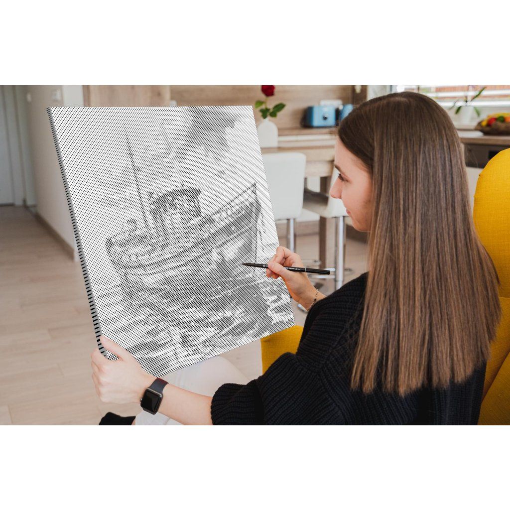 Hlavná úloha spočíva vo vypĺňaní koliesok rôznych veľkostí, predtlačených na plátne, farebnou fixkou. U niektorých stačí urobiť malú bodku, u väčších koliesok je skôr potrebné vyfarbovať. Chce to trochu trpezlivosti, ale keď sa vám stovky malých bodiek začnú pred očami premieňať na zvolený motív, budete mať chuť začať skákať od radosti. Keď urobíte poslednú bodku za svojím dielom, môžete obdivovať fotku premenenú na dvojfarebnú nádheru a rovno si ju zavesiť na stenu (ak si zvolíte obraz s vnútorným rámom).