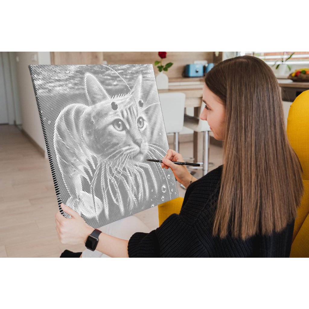 Hlavná úloha spočíva vo vypĺňaní koliesok rôznych veľkostí, predtlačených na plátne, farebnou fixkou. U niektorých stačí urobiť malú bodku, u väčších koliesok je skôr potrebné vyfarbovať. Chce to trochu trpezlivosti, ale keď sa vám stovky malých bodiek začnú pred očami premieňať na zvolený motív, budete mať chuť začať skákať od radosti. Keď urobíte poslednú bodku za svojím dielom, môžete obdivovať fotku premenenú na dvojfarebnú nádheru a rovno si ju zavesiť na stenu (ak si zvolíte obraz s vnútorným rámom).