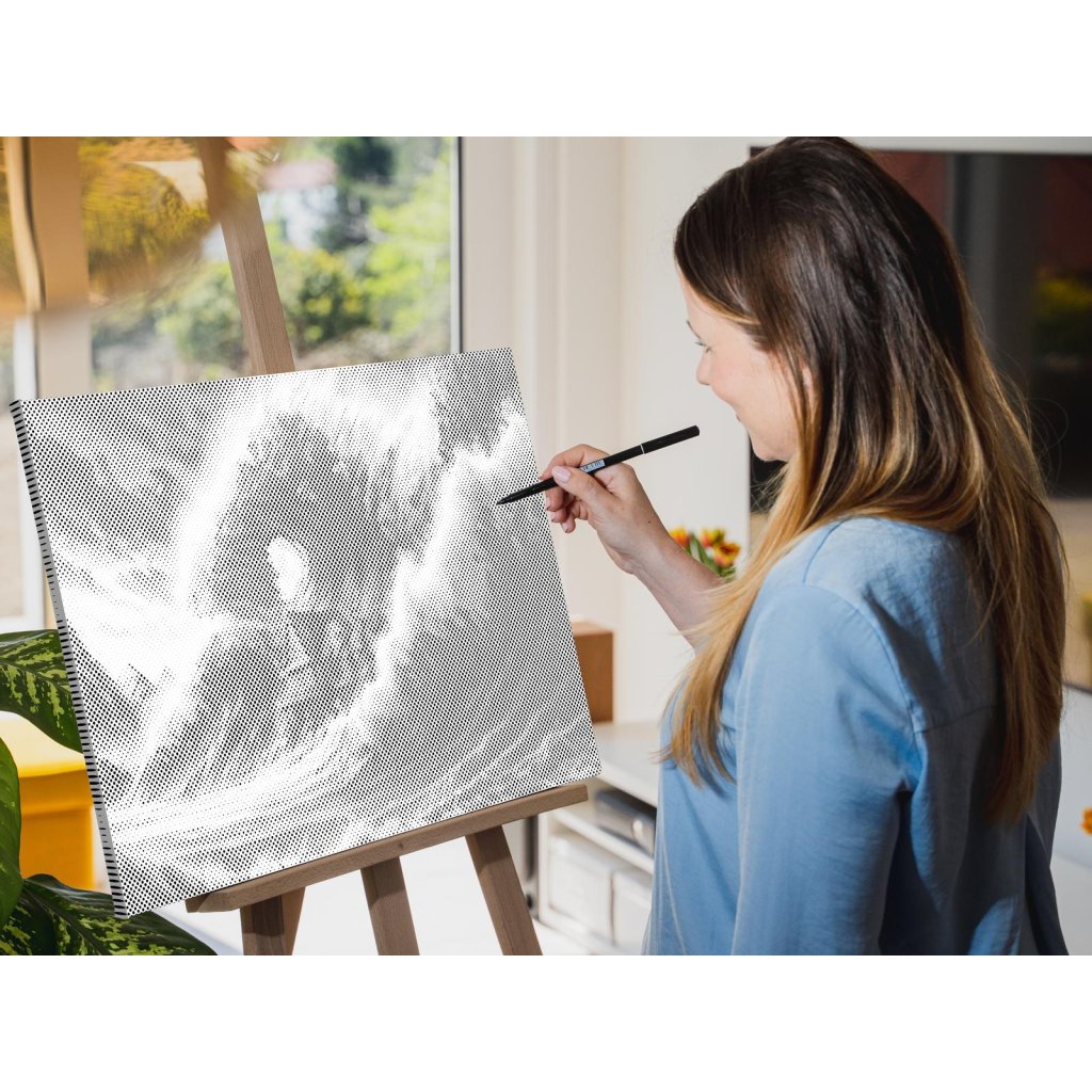 Hlavná úloha spočíva vo vypĺňaní koliesok rôznych veľkostí, predtlačených na plátne, farebnou fixkou. U niektorých stačí urobiť malú bodku, u väčších koliesok je skôr potrebné vyfarbovať. Chce to trochu trpezlivosti, ale keď sa vám stovky malých bodiek začnú pred očami premieňať na zvolený motív, budete mať chuť začať skákať od radosti. Keď urobíte poslednú bodku za svojím dielom, môžete obdivovať fotku premenenú na dvojfarebnú nádheru a rovno si ju zavesiť na stenu (ak si zvolíte obraz s vnútorným rámom).