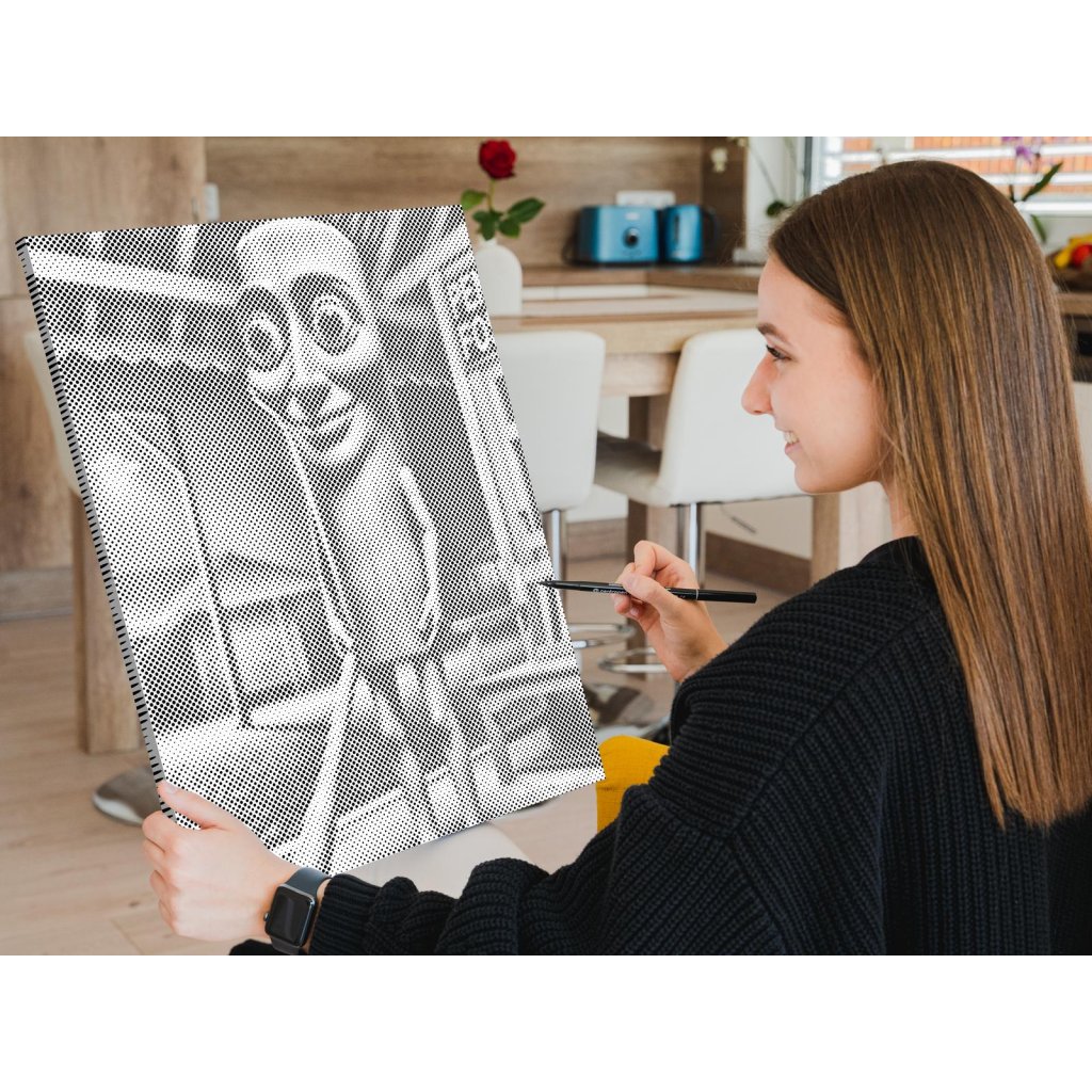 Hlavná úloha spočíva vo vypĺňaní koliesok rôznych veľkostí, predtlačených na plátne, farebnou fixkou. U niektorých stačí urobiť malú bodku, u väčších koliesok je skôr potrebné vyfarbovať. Chce to trochu trpezlivosti, ale keď sa vám stovky malých bodiek začnú pred očami premieňať na zvolený motív, budete mať chuť začať skákať od radosti. Keď urobíte poslednú bodku za svojím dielom, môžete obdivovať fotku premenenú na dvojfarebnú nádheru a rovno si ju zavesiť na stenu (ak si zvolíte obraz s vnútorným rámom).