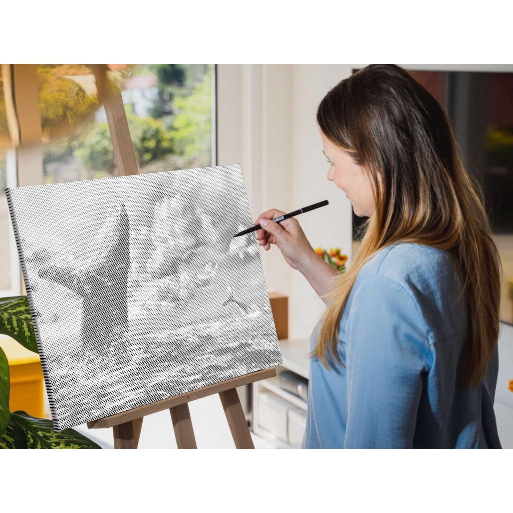 Hlavná úloha spočíva vo vypĺňaní koliesok rôznych veľkostí, predtlačených na plátne, farebnou fixkou. U niektorých stačí urobiť malú bodku, u väčších koliesok je skôr potrebné vyfarbovať. Chce to trochu trpezlivosti, ale keď sa vám stovky malých bodiek začnú pred očami premieňať na zvolený motív, budete mať chuť začať skákať od radosti. Keď urobíte poslednú bodku za svojím dielom, môžete obdivovať fotku premenenú na dvojfarebnú nádheru a rovno si ju zavesiť na stenu (ak si zvolíte obraz s vnútorným rámom).