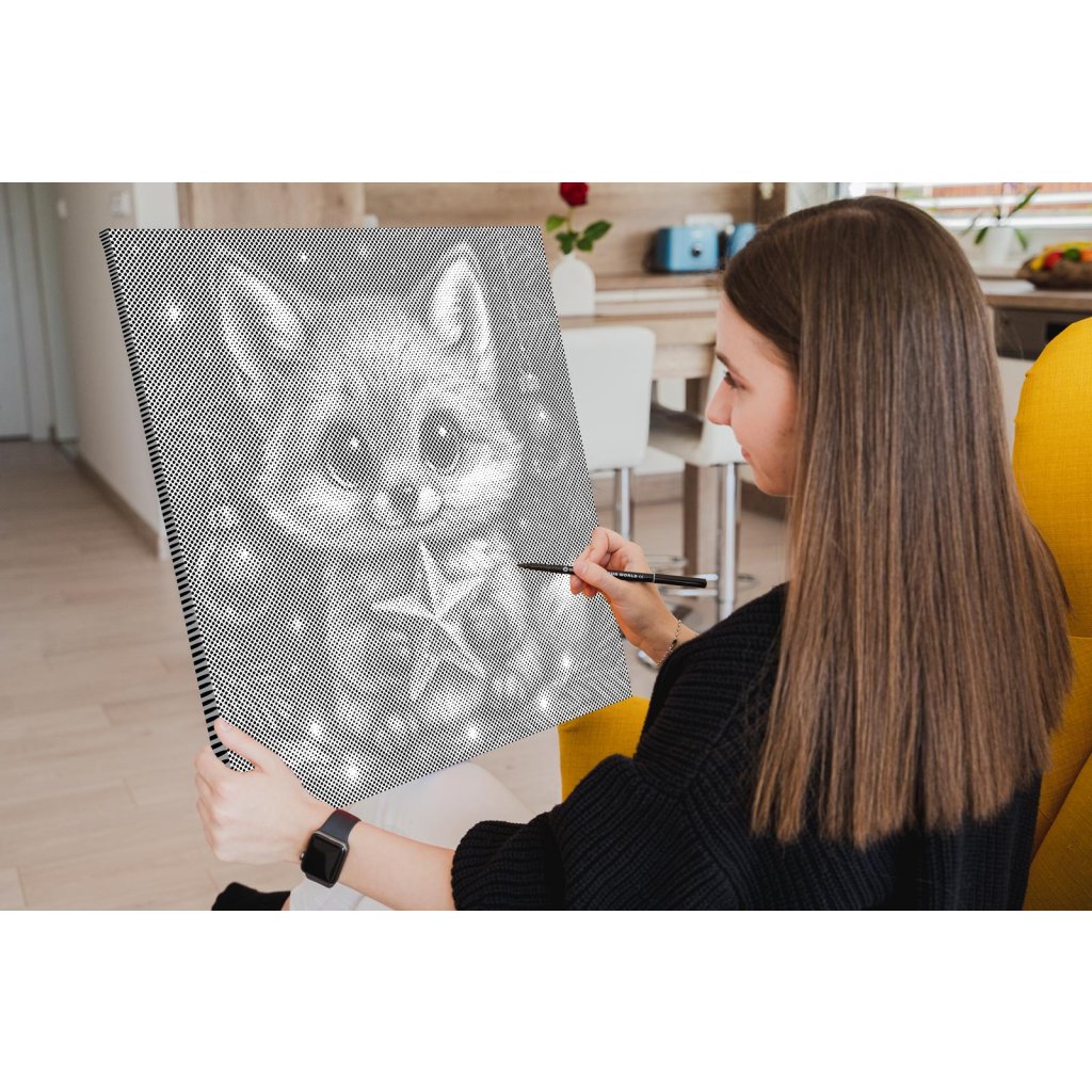 Hlavná úloha spočíva vo vypĺňaní koliesok rôznych veľkostí, predtlačených na plátne, farebnou fixkou. U niektorých stačí urobiť malú bodku, u väčších koliesok je skôr potrebné vyfarbovať. Chce to trochu trpezlivosti, ale keď sa vám stovky malých bodiek začnú pred očami premieňať na zvolený motív, budete mať chuť začať skákať od radosti. Keď urobíte poslednú bodku za svojím dielom, môžete obdivovať fotku premenenú na dvojfarebnú nádheru a rovno si ju zavesiť na stenu (ak si zvolíte obraz s vnútorným rámom).