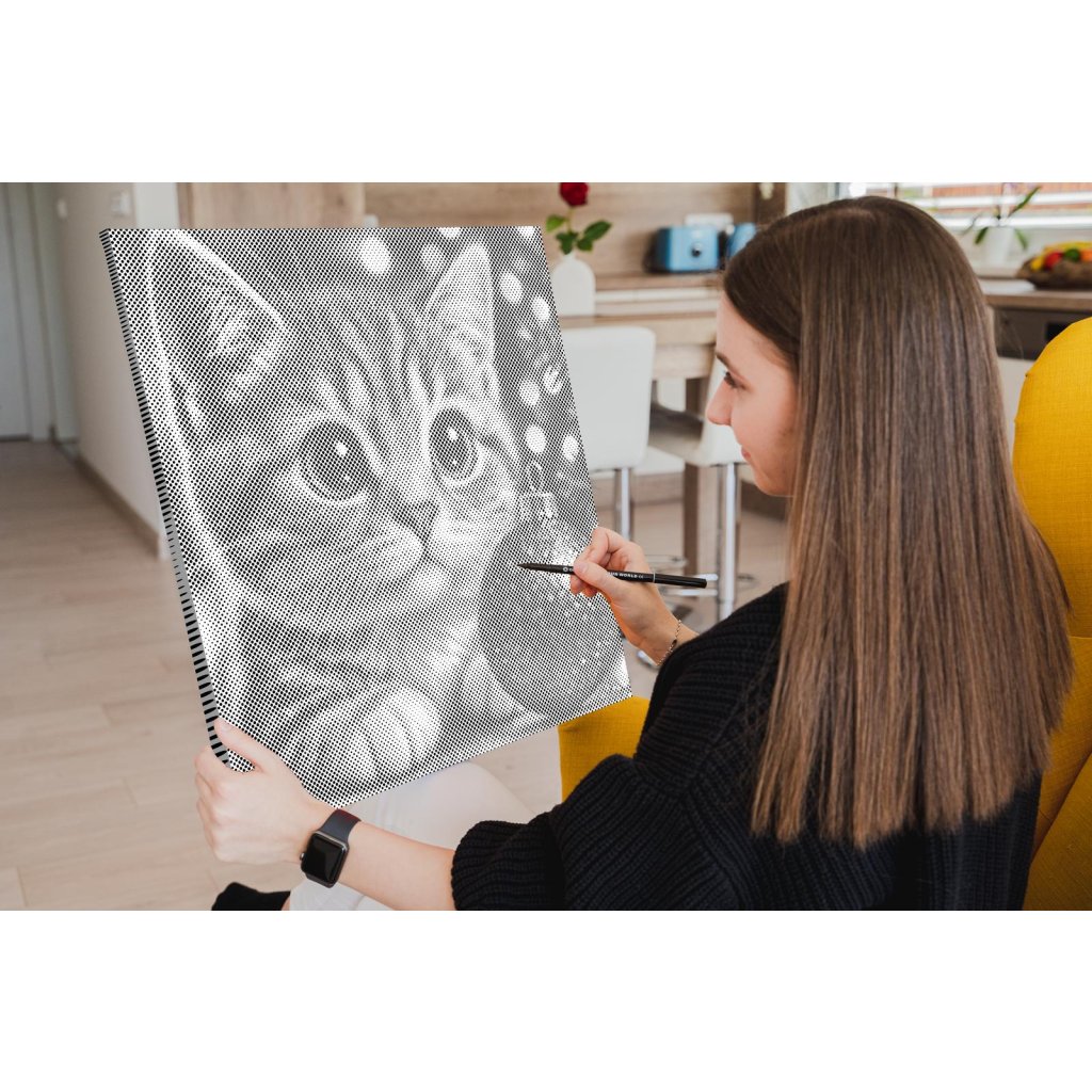 Hlavná úloha spočíva vo vypĺňaní koliesok rôznych veľkostí, predtlačených na plátne, farebnou fixkou. U niektorých stačí urobiť malú bodku, u väčších koliesok je skôr potrebné vyfarbovať. Chce to trochu trpezlivosti, ale keď sa vám stovky malých bodiek začnú pred očami premieňať na zvolený motív, budete mať chuť začať skákať od radosti. Keď urobíte poslednú bodku za svojím dielom, môžete obdivovať fotku premenenú na dvojfarebnú nádheru a rovno si ju zavesiť na stenu (ak si zvolíte obraz s vnútorným rámom).