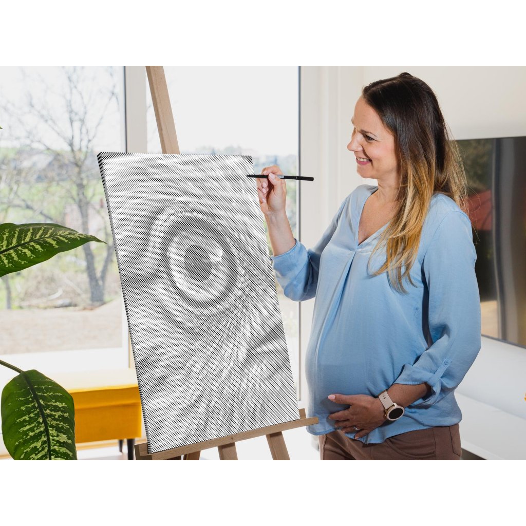 Hlavná úloha spočíva vo vypĺňaní koliesok rôznych veľkostí, predtlačených na plátne, farebnou fixkou. U niektorých stačí urobiť malú bodku, u väčších koliesok je skôr potrebné vyfarbovať. Chce to trochu trpezlivosti, ale keď sa vám stovky malých bodiek začnú pred očami premieňať na zvolený motív, budete mať chuť začať skákať od radosti. Keď urobíte poslednú bodku za svojím dielom, môžete obdivovať fotku premenenú na dvojfarebnú nádheru a rovno si ju zavesiť na stenu (ak si zvolíte obraz s vnútorným rámom).