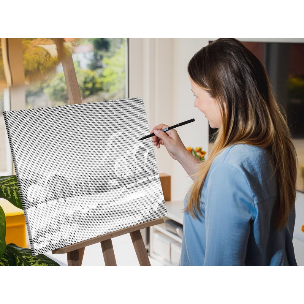 Hlavná úloha spočíva vo vypĺňaní koliesok rôznych veľkostí, predtlačených na plátne, farebnou fixkou. U niektorých stačí urobiť malú bodku, u väčších koliesok je skôr potrebné vyfarbovať. Chce to trochu trpezlivosti, ale keď sa vám stovky malých bodiek začnú pred očami premieňať na zvolený motív, budete mať chuť začať skákať od radosti. Keď urobíte poslednú bodku za svojím dielom, môžete obdivovať fotku premenenú na dvojfarebnú nádheru a rovno si ju zavesiť na stenu (ak si zvolíte obraz s vnútorným rámom).