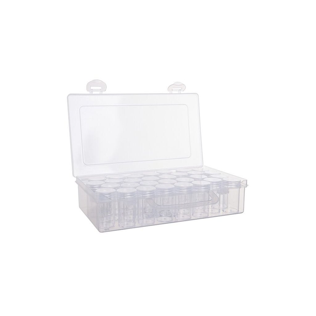Doporučujeme túto plastovú krabičku, v ktorej je 30 uzatvárateľných fľaštičiek na diamanty s priehľadným viečkom.